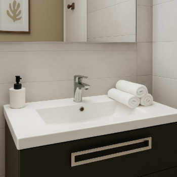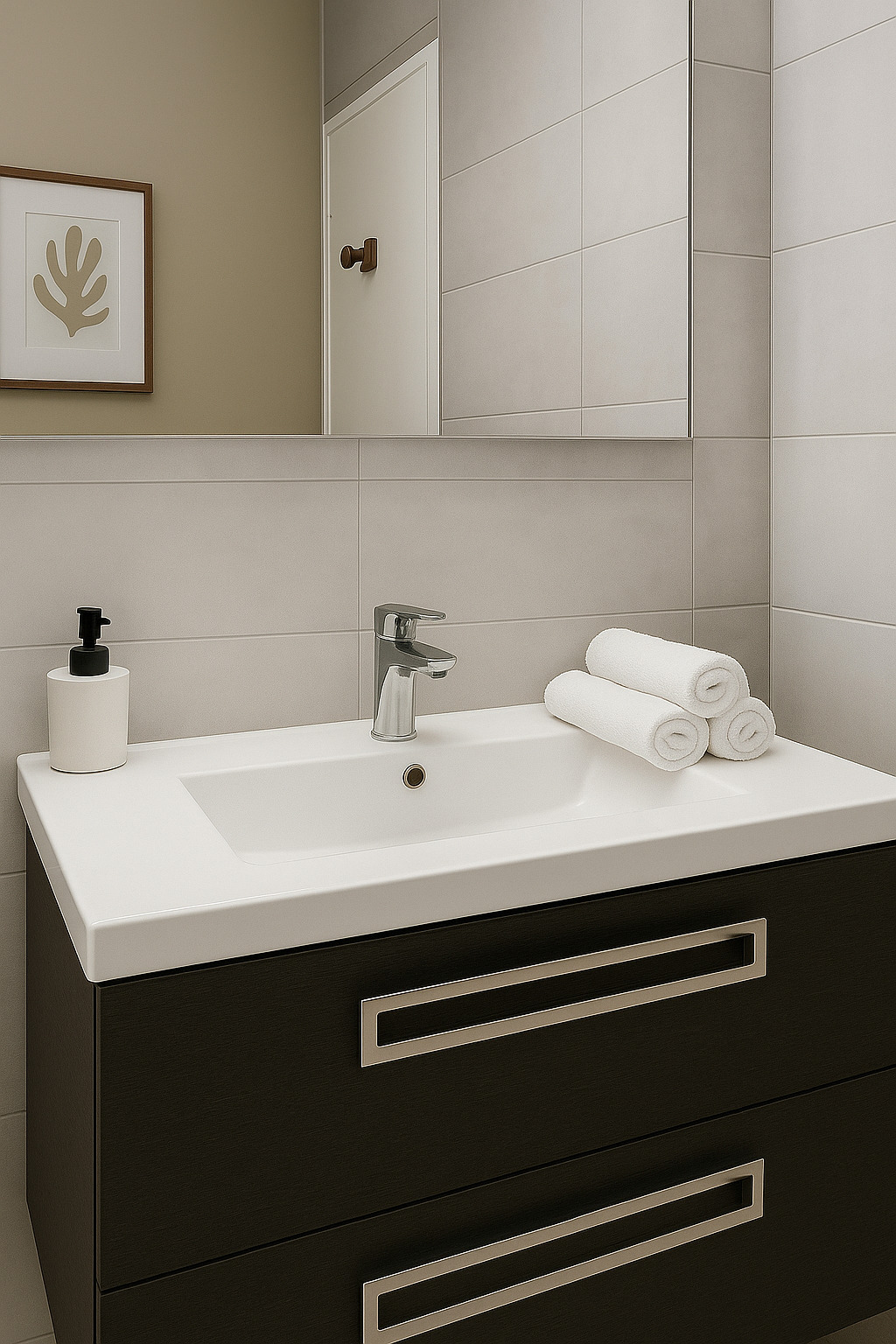- l'une d'elles se situe au rez-de-chaussée : douche italienne, meuble vasque, sèche-serviettes électrique, wc.